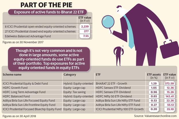 While it is common to see asset allocation funds investing in gold ETFs or even equity ETFs based on broad market indices, it is still not common for actively managed equity funds adding ETFs. “The merit of investing in an ETF is that it allows you to take exposure to a number of stocks if one is bullish on the constituents of the ETF. In case of Bharat 22 ETF, the investment made provided reasonable return in a short span of time,” said Raghav.